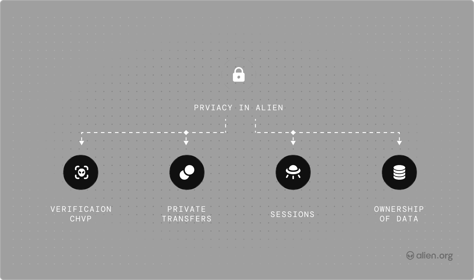 The verifiable and mathematically guaranteed privacy of the decentralized Alien Network, enables users to exist online while retaining full control over their data and identity. This extends to transfers on the network. The Alien Network supports privacy-preserving transfers for all transactions, whether between Alien IDs or Sessions. These transfers are un-linkable to any identity, ensuring users can freely manage and move their data and assets while maintaining complete privacy and ownership.