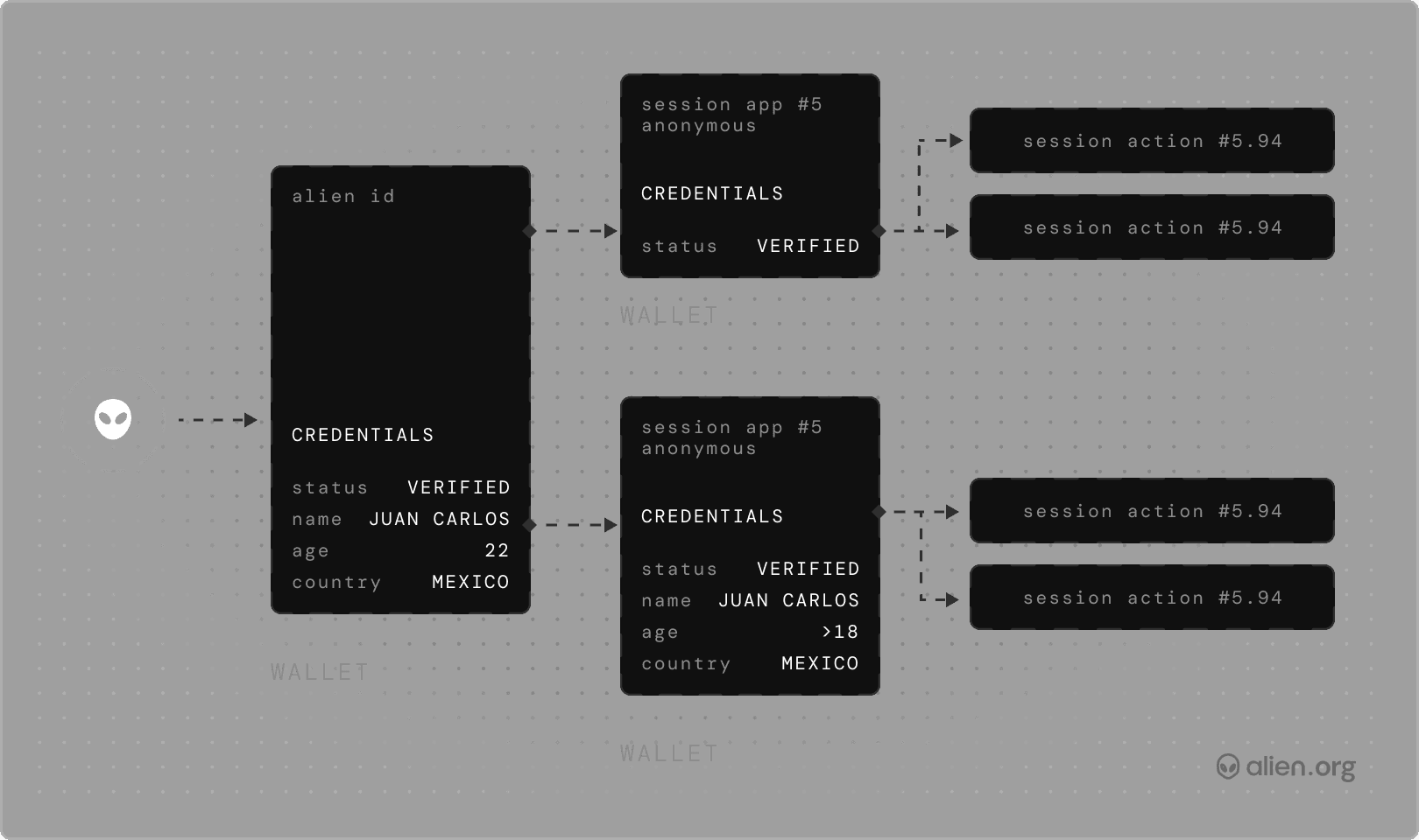 Personal data remains under user control — stored where and how they choose — while cryptographic proofs are recorded on-chain and linked to each Alien ID. Users alone decide when and with whom to share their information. This creates a framework where individuals have complete control over their identity attributes, enabling secure management of their identity across different contexts and platforms (through cryptographically derived sub-identities called Sessions).