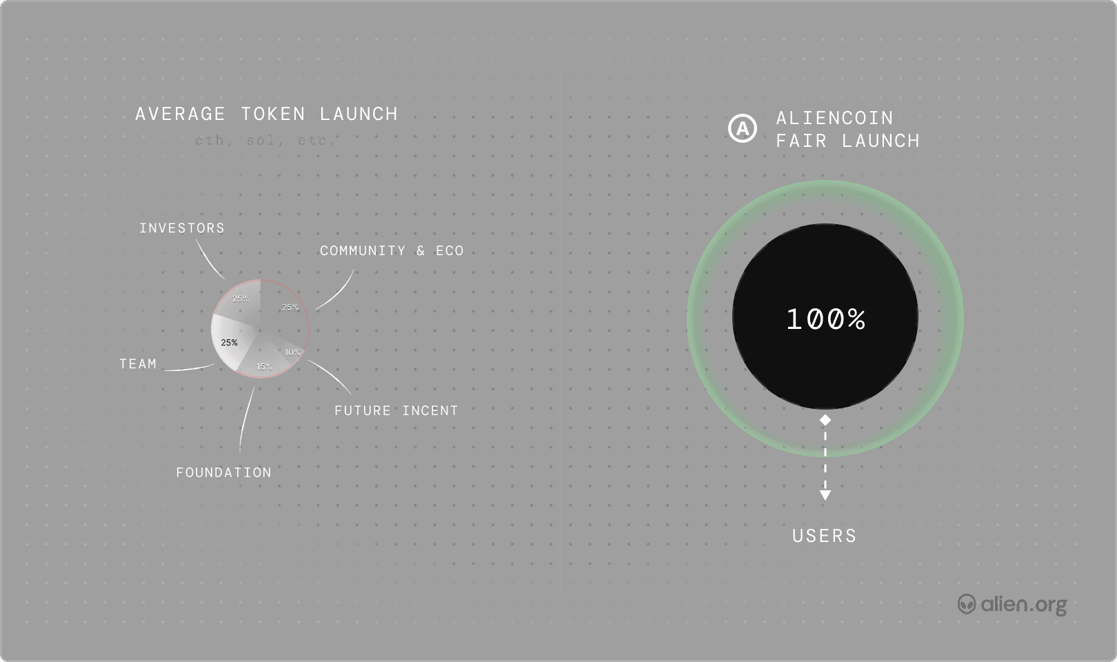 As each verified person represents irreplaceable value, Aliencoin leverages Metcalfe's Law, where a network's value grows exponentially with each new participant. Aliencoin will be launched with a fair distribution model: no pre-allocated coins for founders or investors, and no opportunities to pre-mine or purchase coins before mainnet launch. Once verified, each user receives equal allocations, with additional grants distributed as they engage with the network. This ensures Aliencoin functions as compensation for verification and participation.