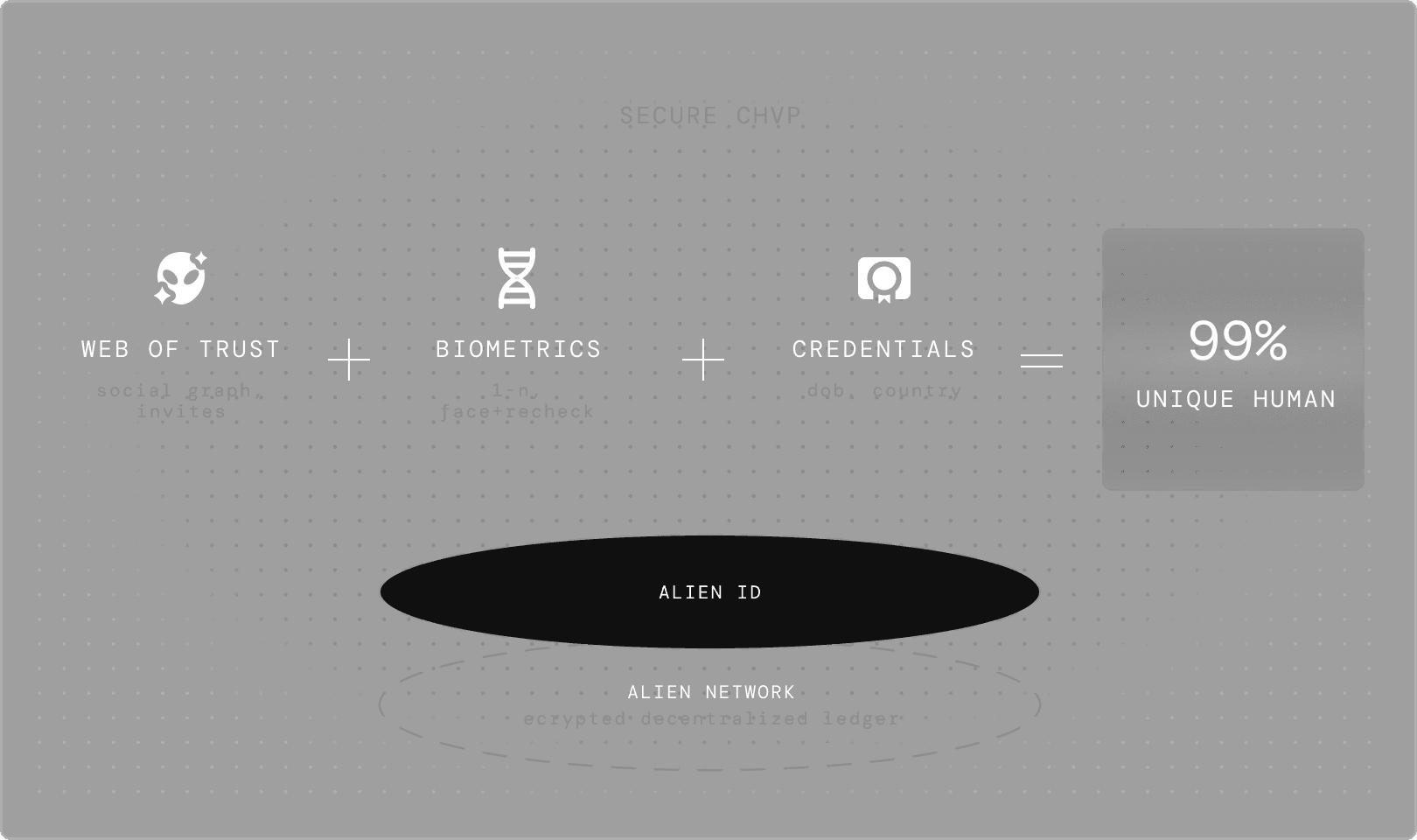 In digital systems, PoP is a way of preventing Sybil attacks that lead to disproportionate influence or rewards. Attempts to solve this challenge have consistently created new problems: centralized biometric systems raise privacy concerns and present attractive targets for hackers; social graphs can be gamed through fake profiles; and economic barriers favor those with money to circumvent them. Previous approaches have focused on making systematic attacks expensive without addressing the structural issues that enable deception. What's needed is not just protection, but a system where honest participation remains accessible and deception becomes exponentially more costly. The Alien Network meets this need with an architecture for self-sovereign verification, which is enacted through the Alien ID.