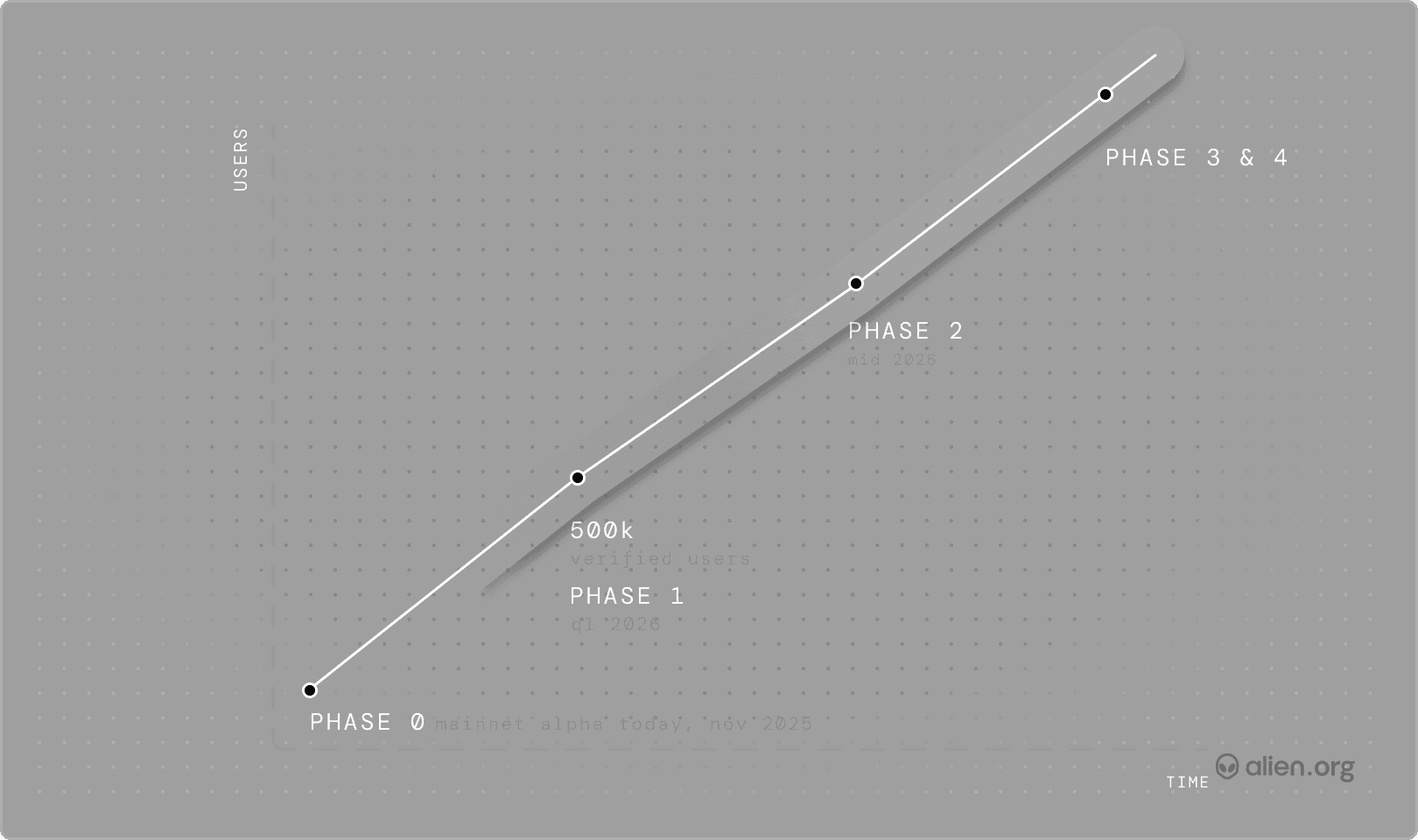 Phase 0 (Alpha) will support up to 500,000 users worldwide. These users will join using only biometric verification. During this initial phase, the network's nodes will be centralized, but all verification processes remain encrypted and secure. The network's trust model is established from day one, ensuring the Alien team cannot create fake users or access personal data. All verification processes will be recorded as cryptographic proofs within our Frame system, allowing anyone to independently audit that each user was uniquely verified.